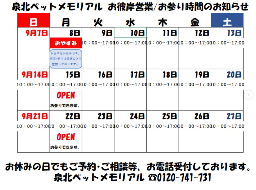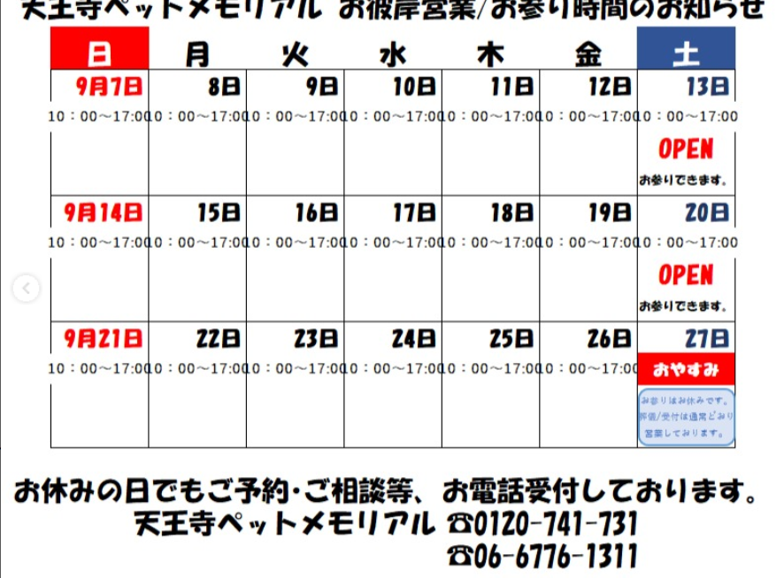9月お彼岸のお参りのお知らせです。 Posted on 2025年8月27日2025年9月22日 お知らせ 皆様こんにちは! 9月お彼岸のお参りのお知らせです。 泉北店は通常、月曜日におやすみをいただいておりますが、 14日・21日はオープン予定です!(写真1枚目) 天王寺店は通常土曜日におやすみをいただいておりますが、 13日・30日はオープン予定です!(写真2枚目) ぜひお手を合わせにきてあげてください😊